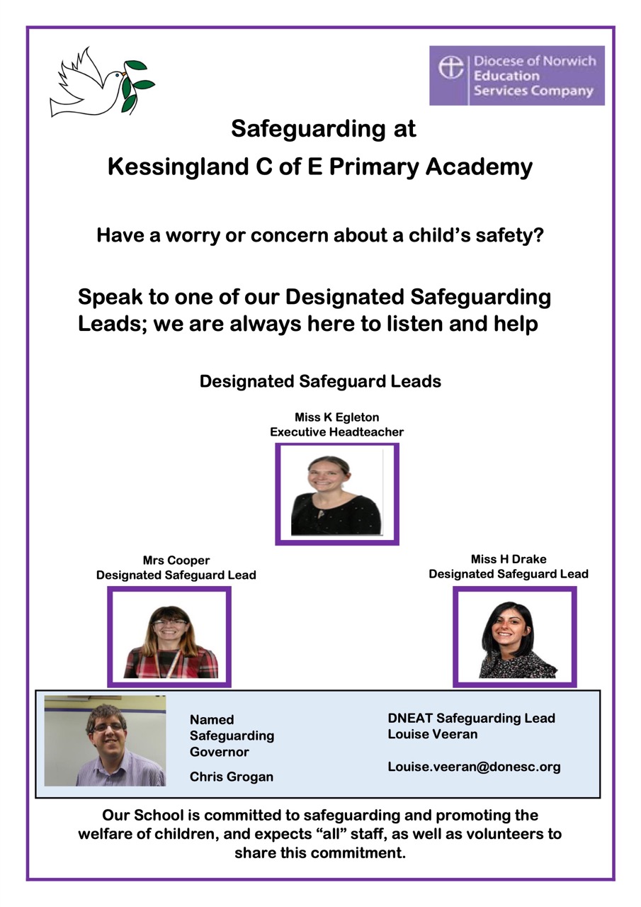 At Kessingland Church of England Primary Academy, the child’s welfare is of paramount importance. Our academy will establish and maintain an ethos where pupils feel secure, are encouraged to talk, are listened to and are safe. Children at our academy will be able to talk freely to any member of staff at our academy if they are worried or concerned about something.
